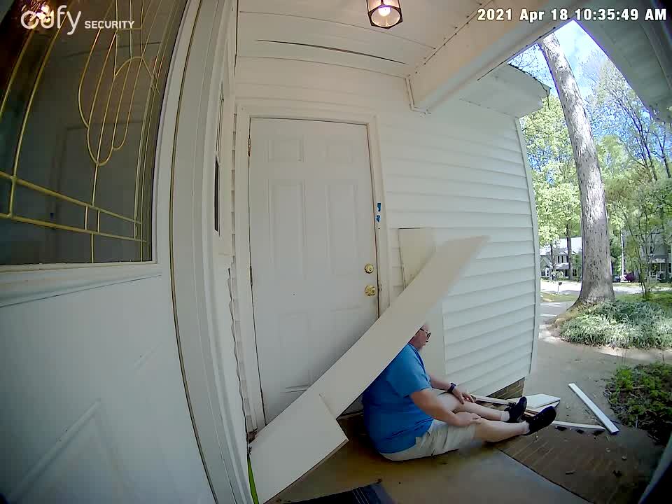 A man trips and falls up a porch step, then a board of wood falls on him. Security footage.