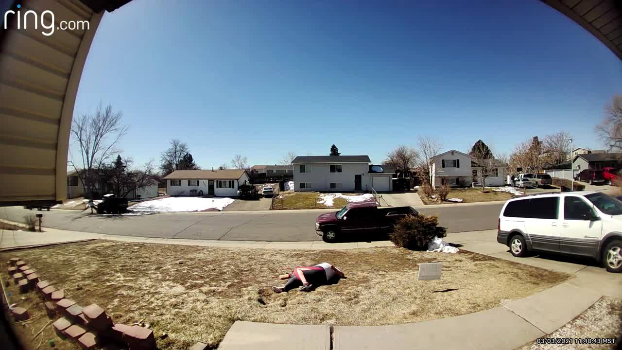 A woman falls onto her back when she walks up the porch steps, and says "I'm on the ground". Then she struggles to open the front door and talks about how the camera recorded her fall. Security footage.