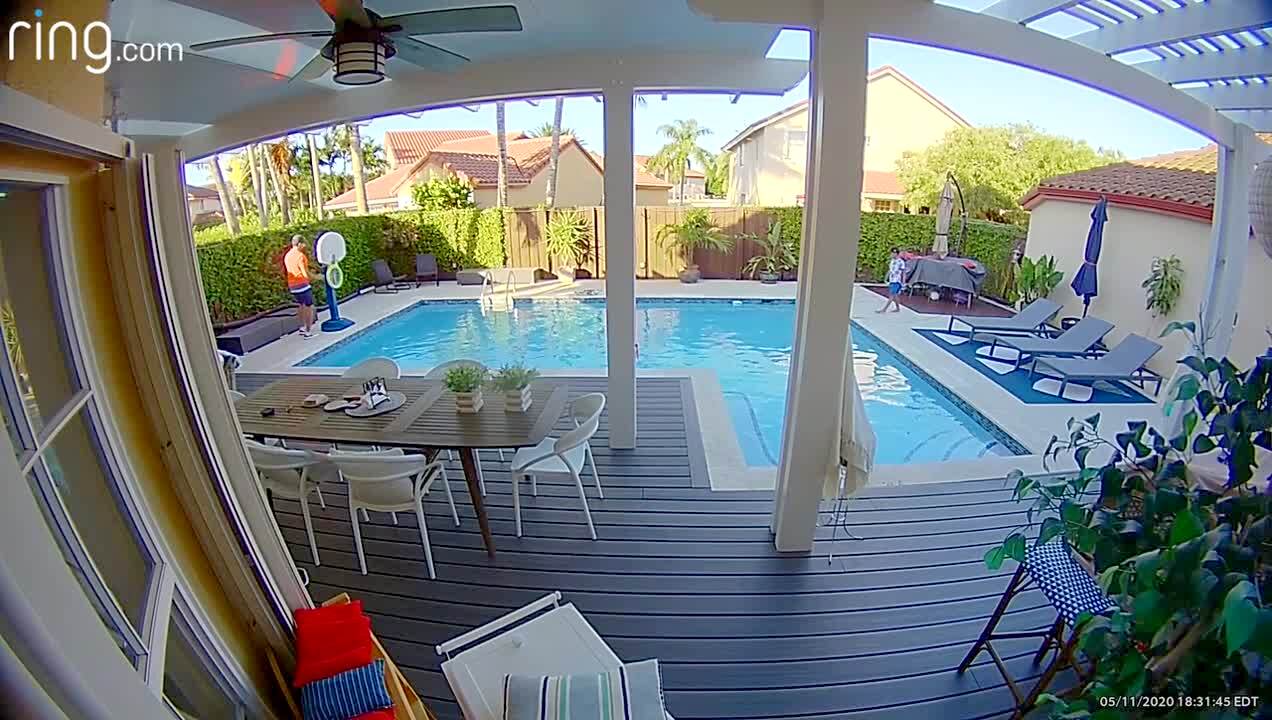 A man carries a toy basketball hoop in a yard and he slips and falls into a swimming pool. Security footage. Music not cleared.