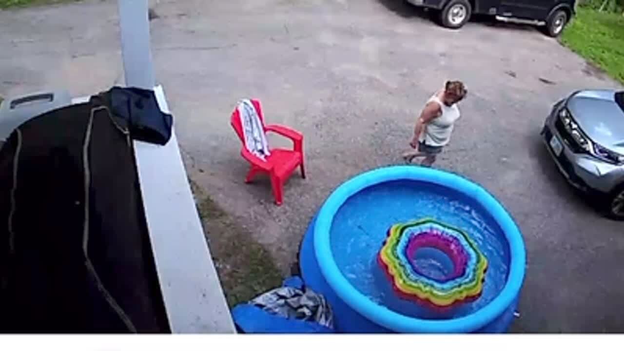 A woman climbs into an inflatable kiddie pool in a driveway and trips and falls. Security footage.