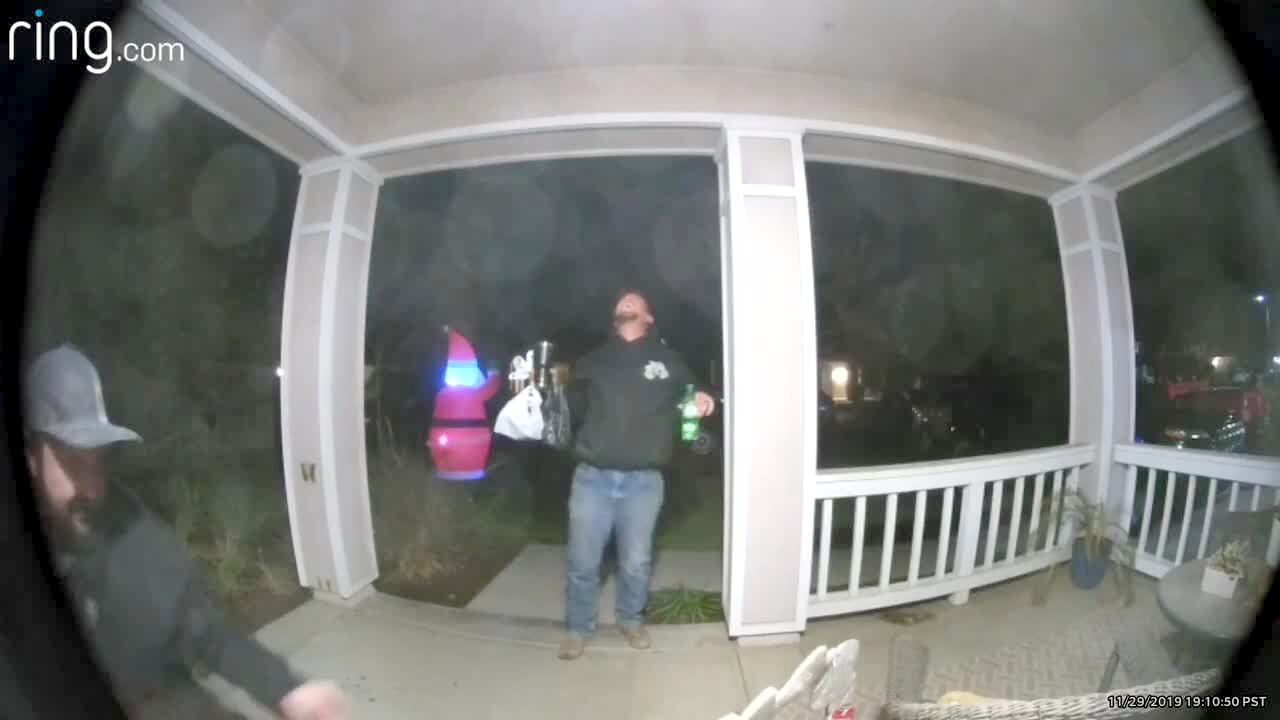 Two men walk through a yard onto a porch at night and one of the men trips over a sprinkler head and crashes into the other man and they both fall down.