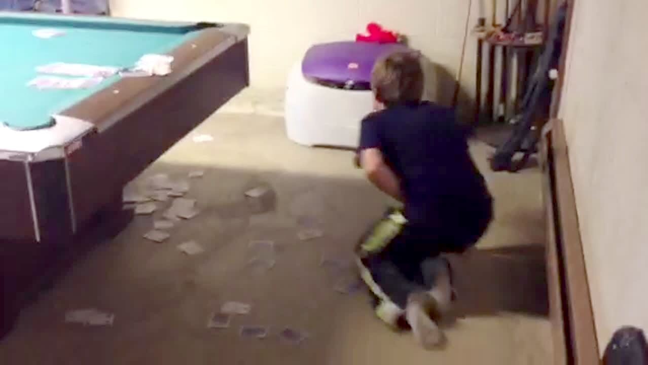 A man tries to force a truck's trunk door closed and the window shatters in a driveway. Security camera footage.