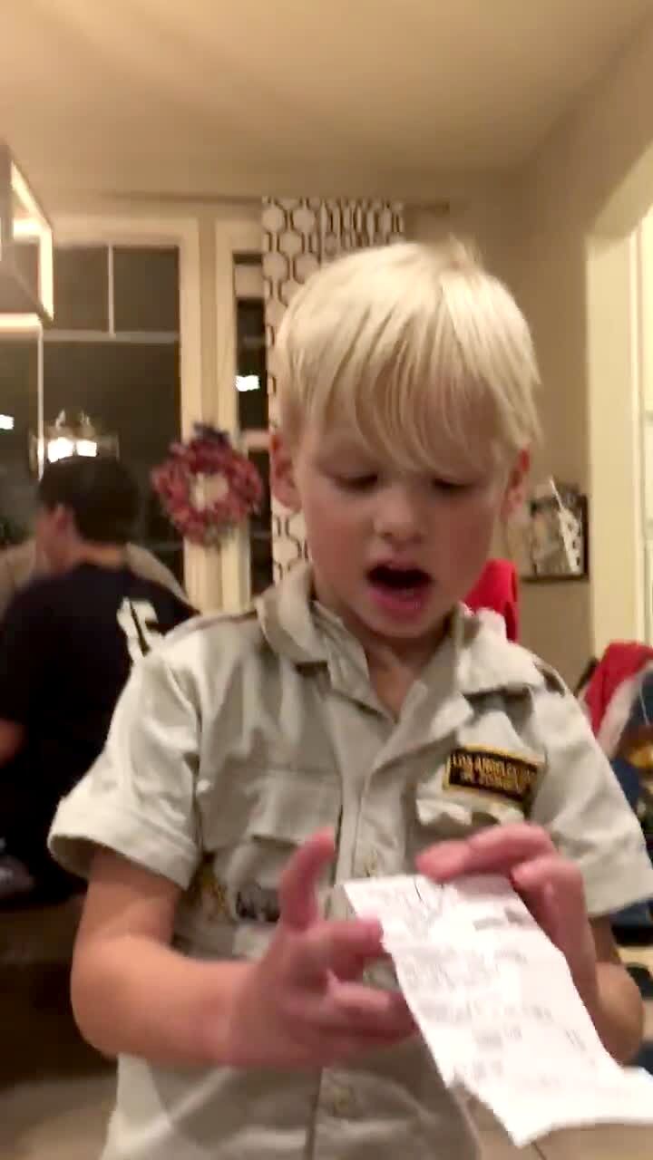 A young boy screams with excitement when he got his first receipt for Christmas.