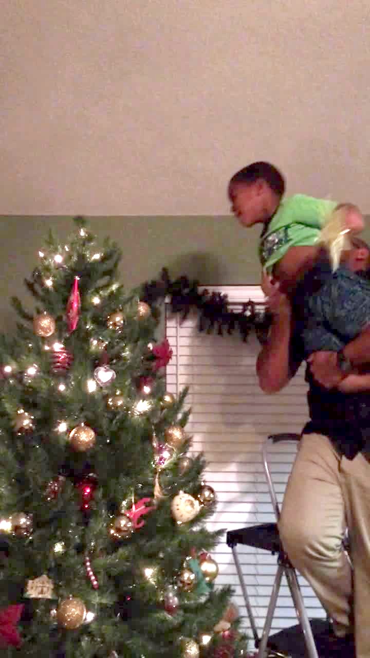 A boy screams that he is scared while a man holds him up to put the star on a Christmas tree at home.
