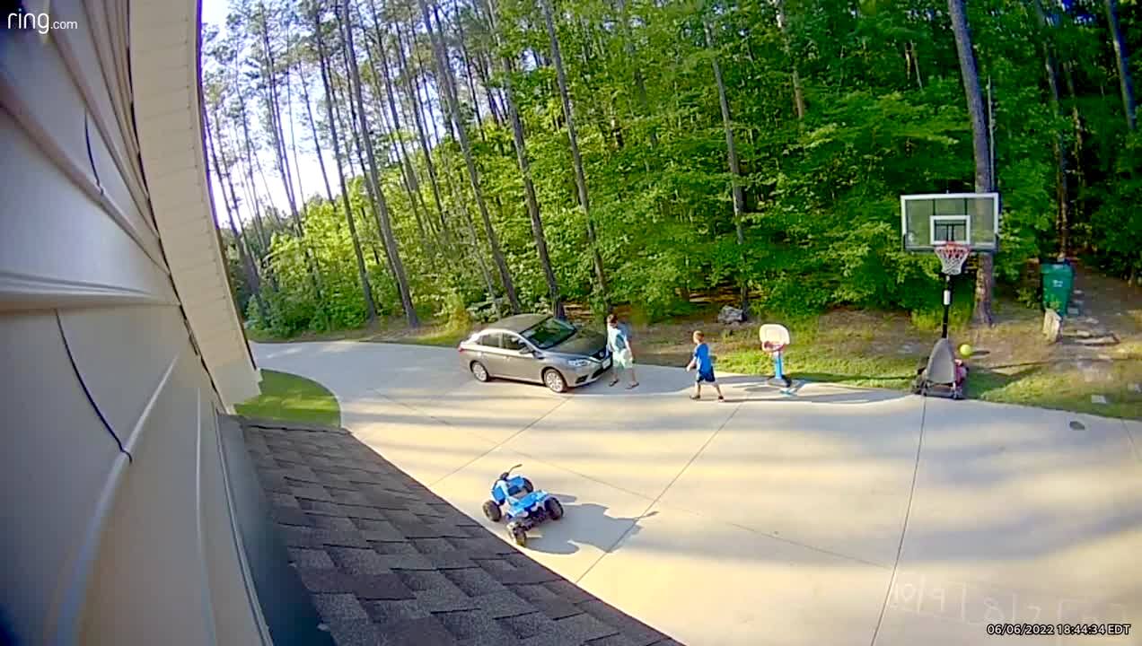 A man mows the grass on a riding lawnmower and he lurches forward and drives off a steep hill into the woods and crashes are heard from off-camera. yard work. Security footage.