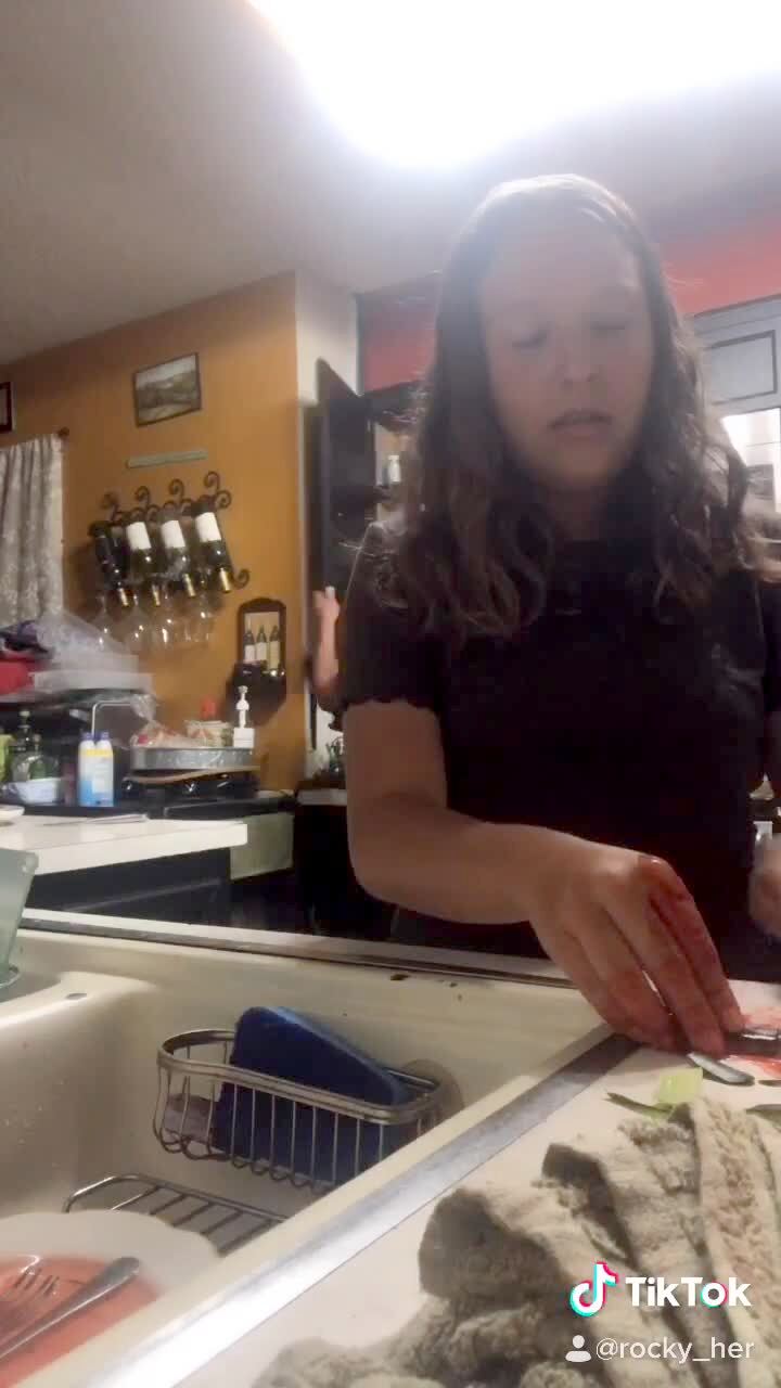 A young girl with red sauce on her fingers pretends to cut her finger with a knife. Her mom looks at her, then screams and faints in a kitchen.