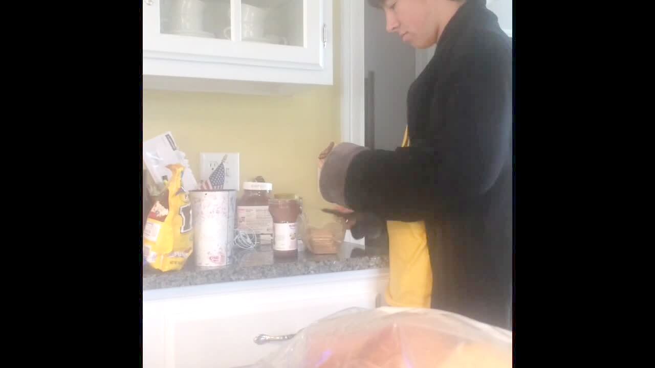 A mom pranks her teen boy son and puts hot sauce in his Nutella spread. He puts it on toast and eats it, then makes a confused face. He coughs and spits up in a kitchen sink and his family laughs hysterically.