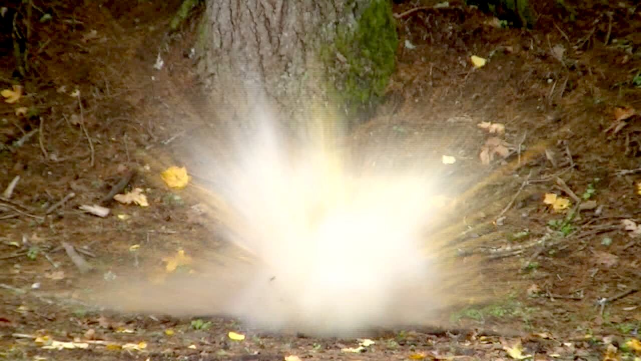 A firecracker blows up a pumpkins jack-o-lanterns outdoors.