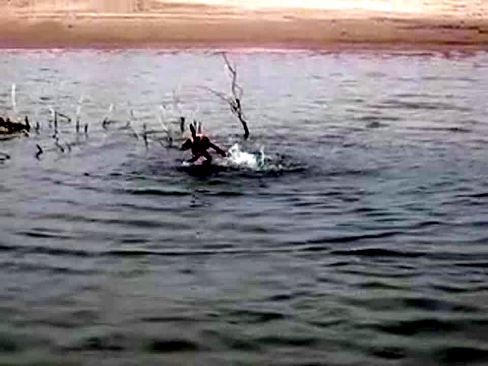 A dog with a stick in his mouth tries to swim to shore but is just swimming in place.