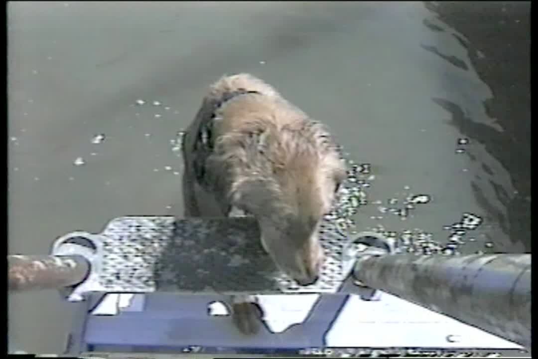 "Dockside Doggie" Dog slips off dock with ball in his mouth.