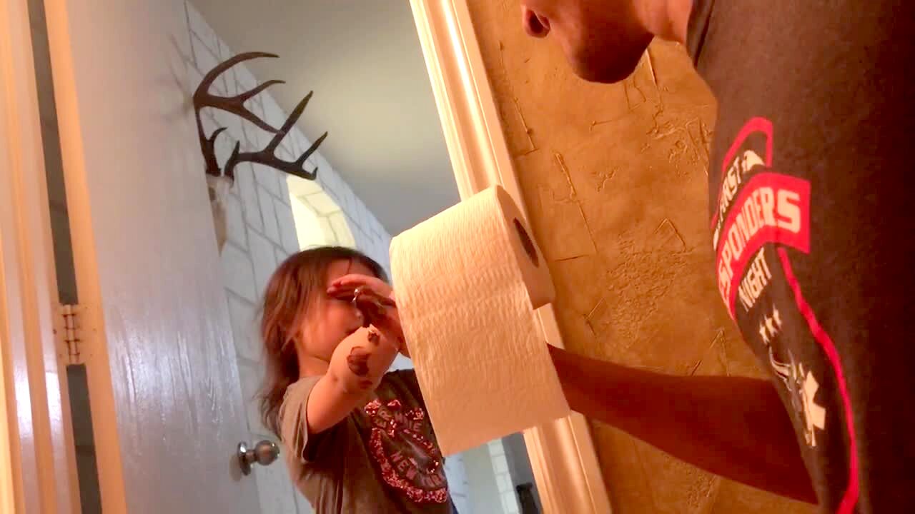 A tot girl eats a cheese wheel with the wax paper still on. The camera pans to a baby girl who shakes her head.