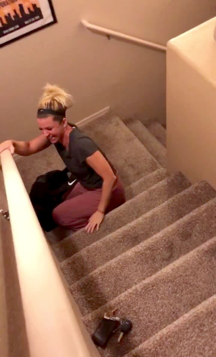 A teen boy stands on a staircase to try and scare his teen sister but fails as she says, "that was dead obvious." When she walks to the top of the stairs and falls back down when her mom pops out and successfully scares her.