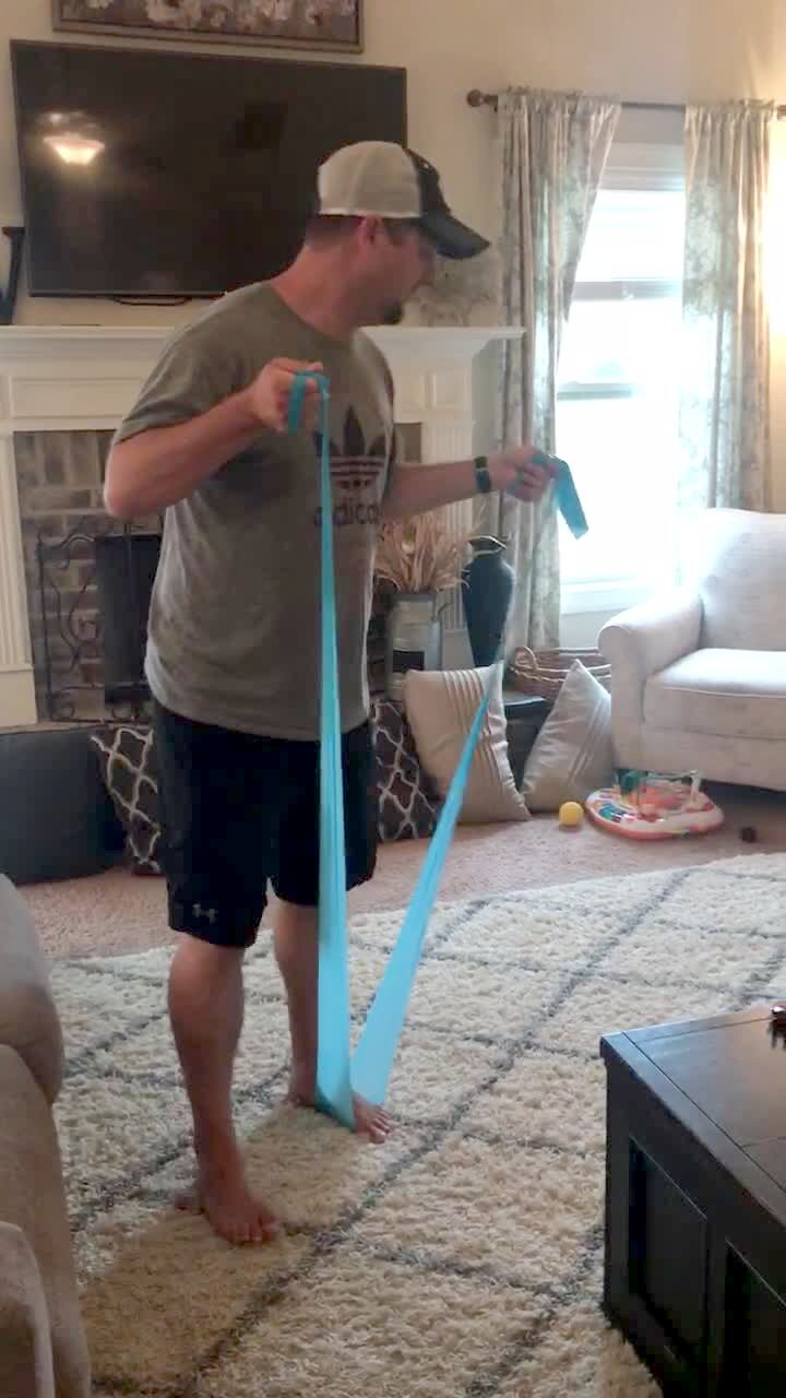 A man gets tangled in the net of a trampoline in the yard while his young sons play around him. The woman behind the camera teases him while he asks for help. He says he fell off the edge of the trampoline and got caught in the net and it broke.