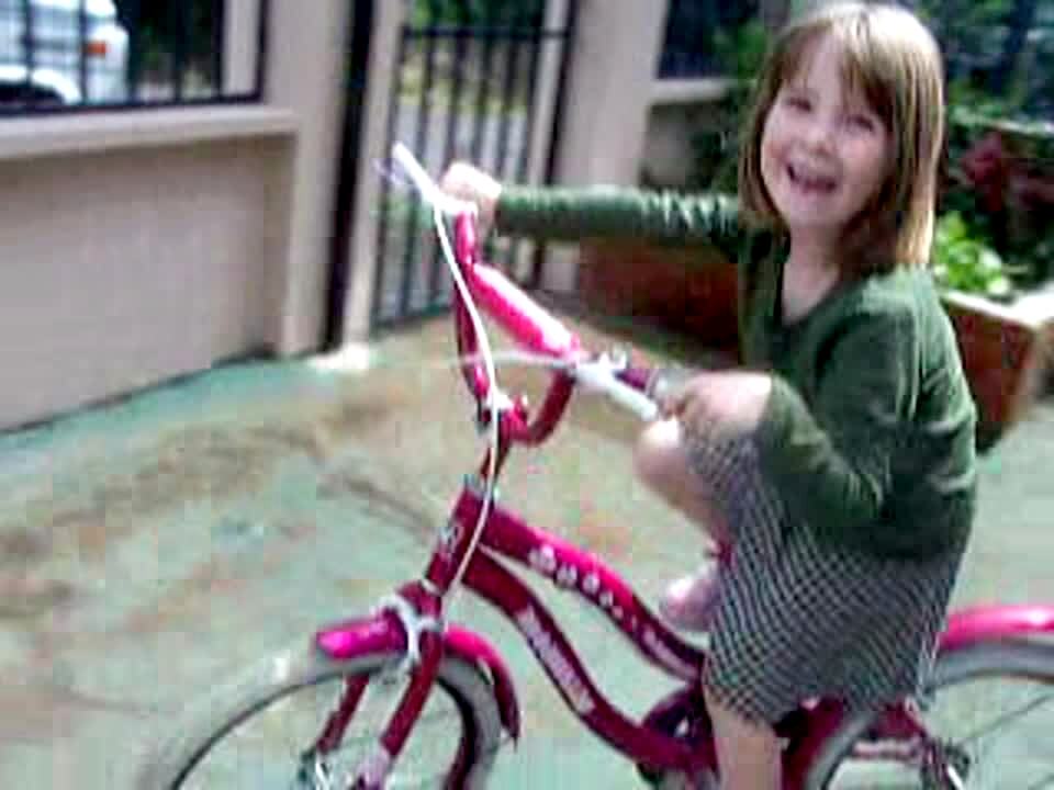 Little girl rides bike around in circles, bragging about not needing training wheels. Then she crashes into little brother, hitting his head. She falls over.