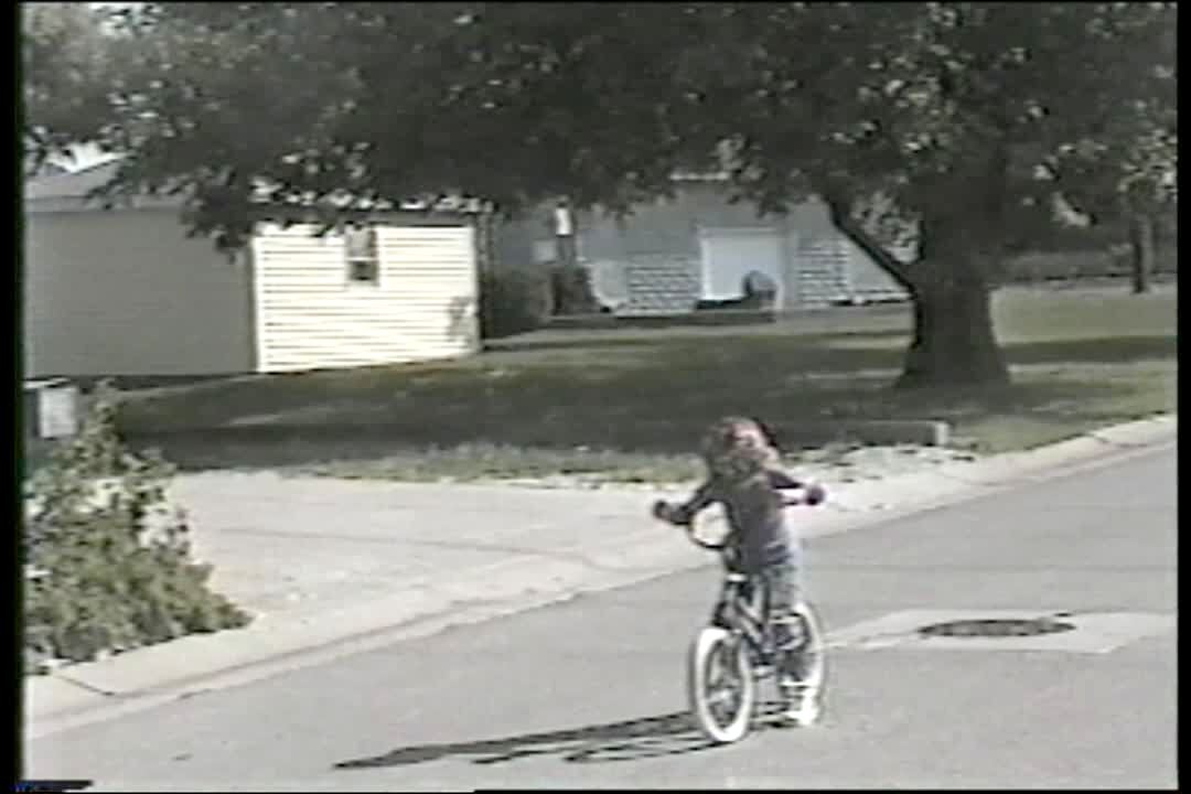 Tot girl drives a green Jeep around the yard with her little brother in the back seat. Boy stands up, girl drives faster, & boy falls out of Jeep. Short tail, no recovery. Boy cries. Power Wheels.