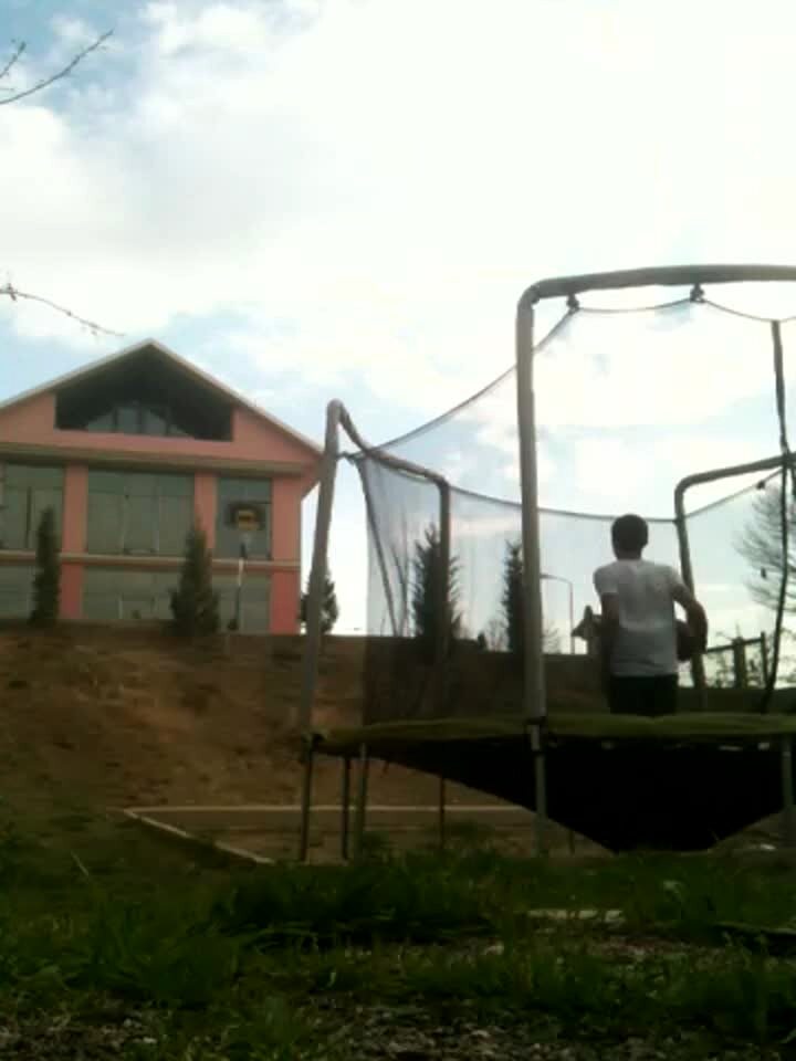 A teen boy does a front flip on a trampoline and throws a basketball at a basket far away and makes the shot.