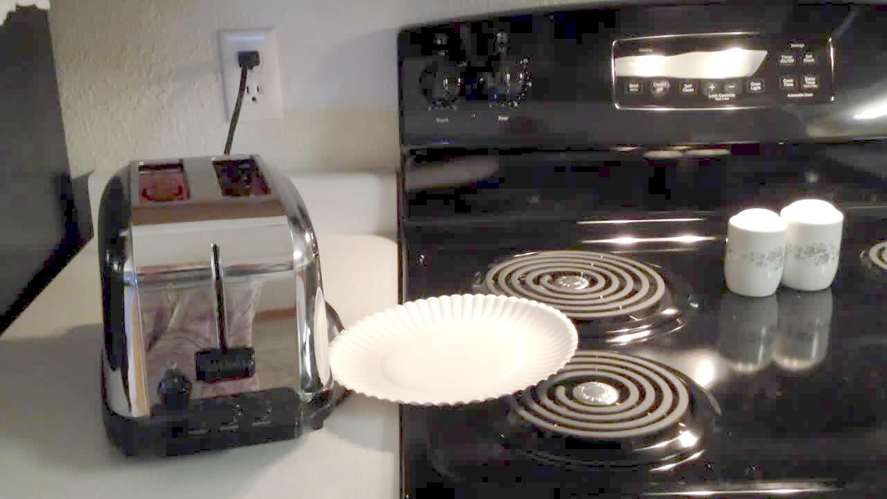 A piece of toast pops out of a toaster on a kitchen counter and it flips and lands on a paper plate.