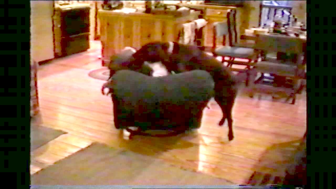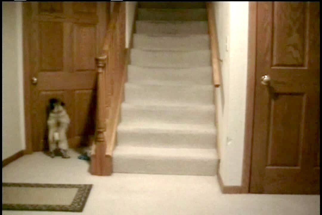 Dog jumps & tries to bite the door knobs on the basement doors when woman runs out of the room. Silly pet.