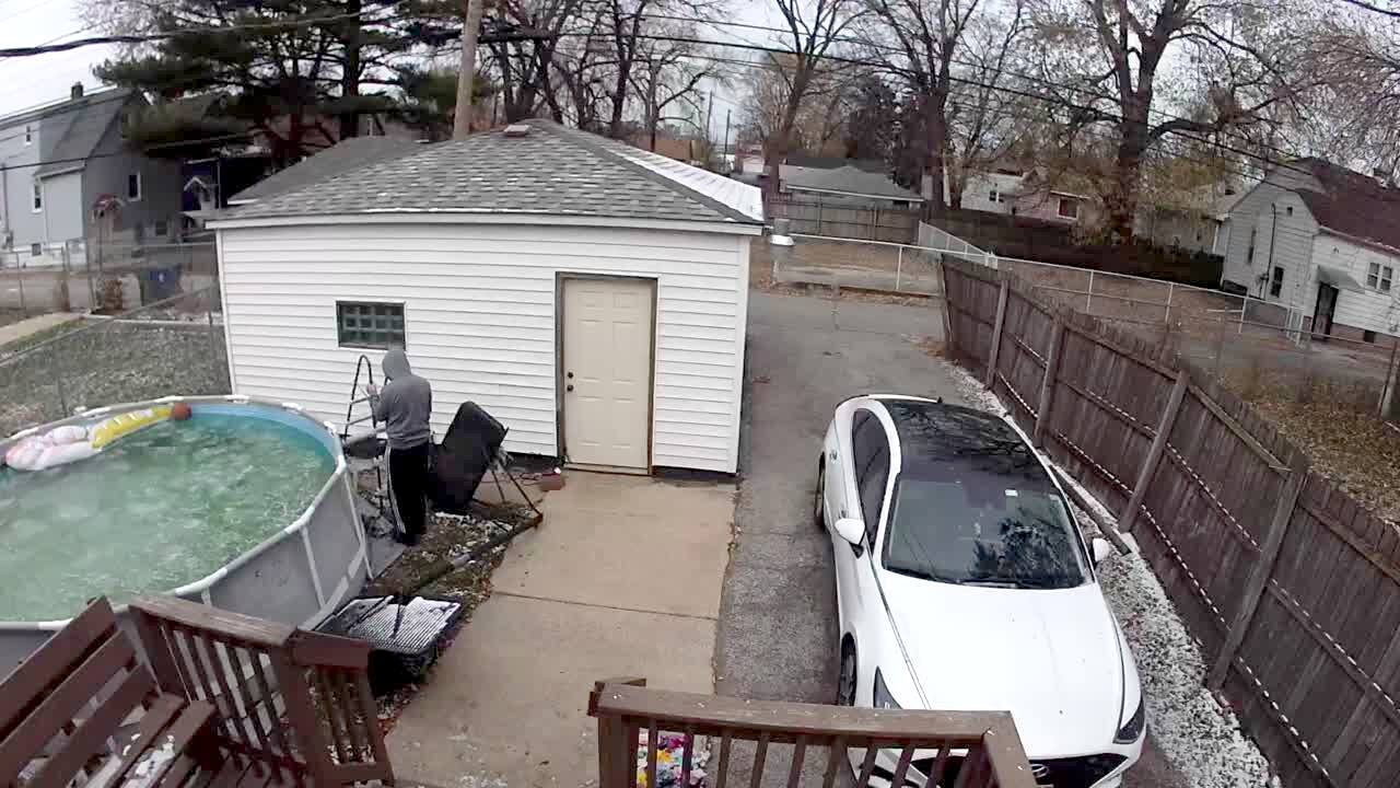 A teen boy checks how thick the ice is on his above ground swimming pool. When he steps onto it, it breaks and he falls into the ice-cold water. Security footage.