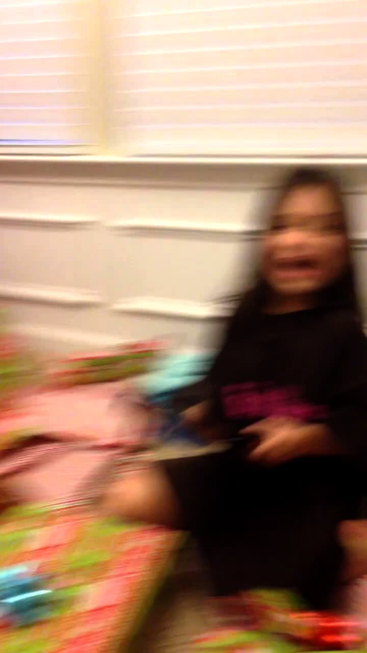 Young girl gets a cell phone for Christmas & screams very loud. She calls the house phone from her cell & screams again when it rings. Excited. Present.