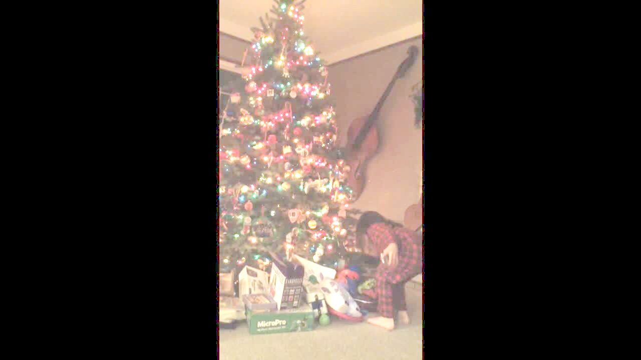 Two girls are showing presents to camera when the Christmas tree starts falling and scares them.
