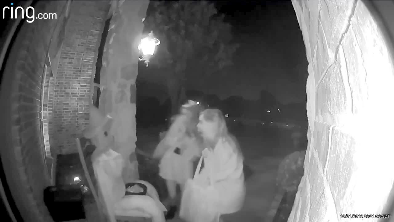 Two teen girls take Halloween candy from a decoration and they scream when it jumps up at them in the front yard. Security footage.