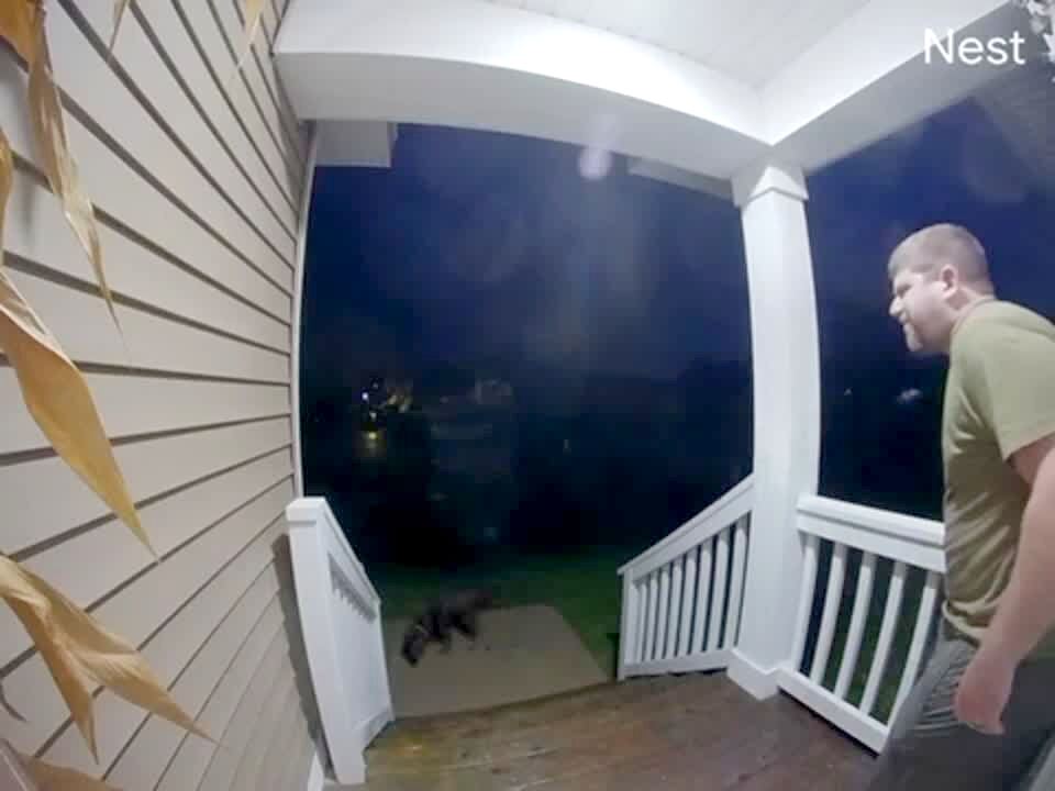 A man opens the porch gate to let his dogs jump into his truck. One dog jumps towards a closed door and collides into the side of the truck. Security footage.