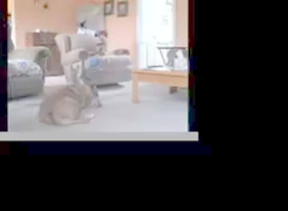 A woman leans on a railing and falls into the yard when it breaks. Then a dog pees on her. Security footage.