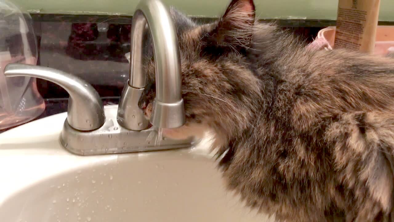A cat sits on a counter top in the bathroom and drinks water from the sink. Then the camera turns to show another cat that sits next to a second sink and it sticks its head under the faucet to drink water, but the water pours on its face instead.