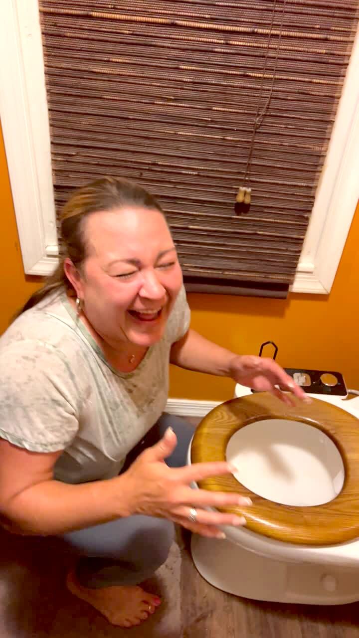 A boy holds a newspaper, crouched on a toilet with a dog in his sweatshirt, making it look like the dog is using the bathroom while reading. The woman behind the camera acts as though she's walked in on him.