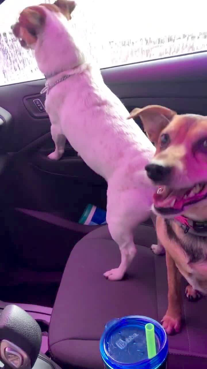 A dog leans onto a car door and rolls down the window as it goes through a carwash.
