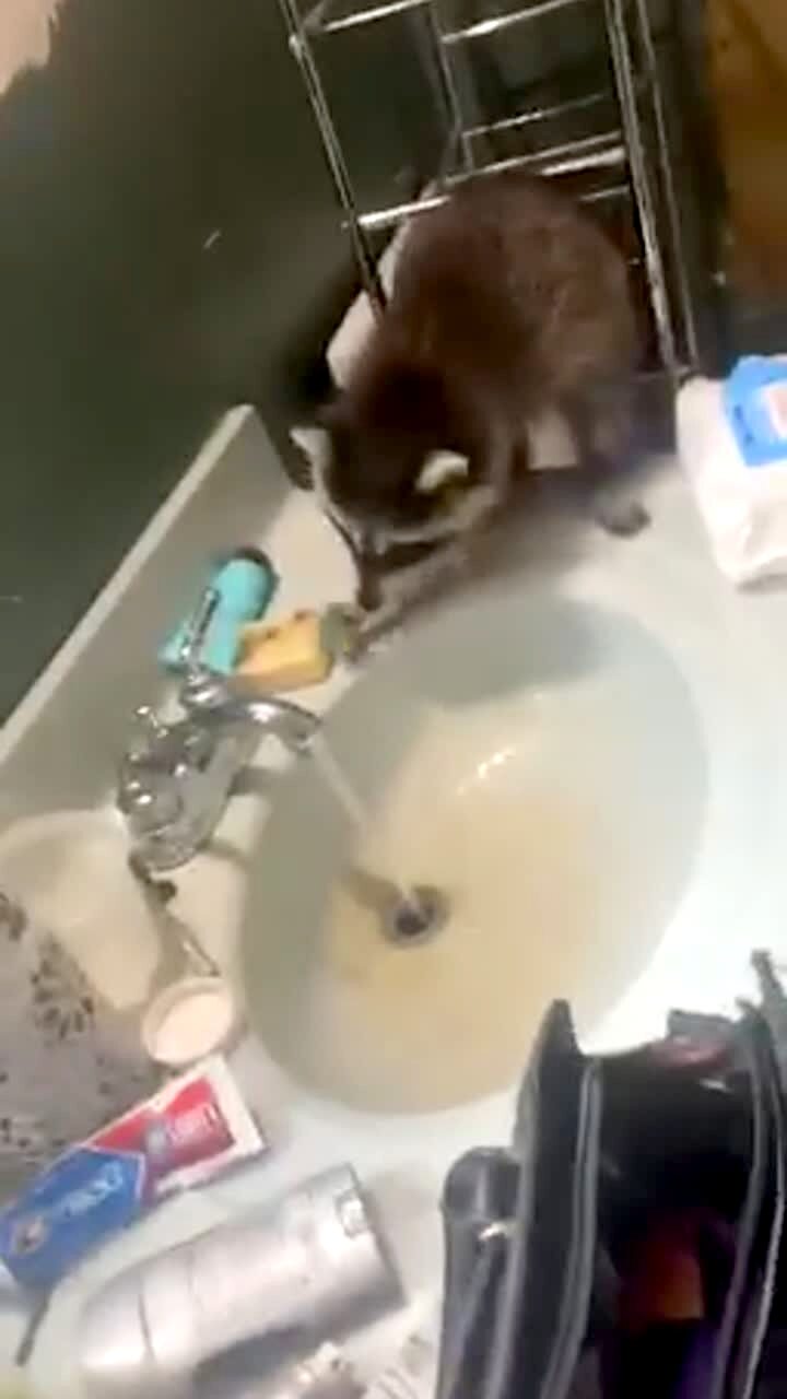 Two teen girls film a raccoon who washes his paws in the bathroom sink.