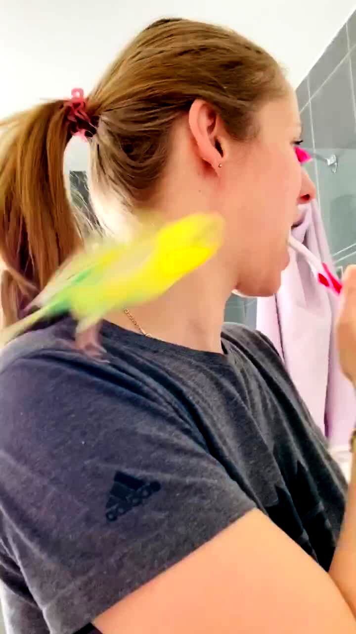 A woman brushes her teeth in the bathroom with a bird on her toothbrush.