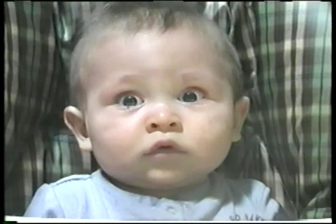 A baby boy in a high chair in the kitchen gives the stink eye on command then laughs and claps. Action :15