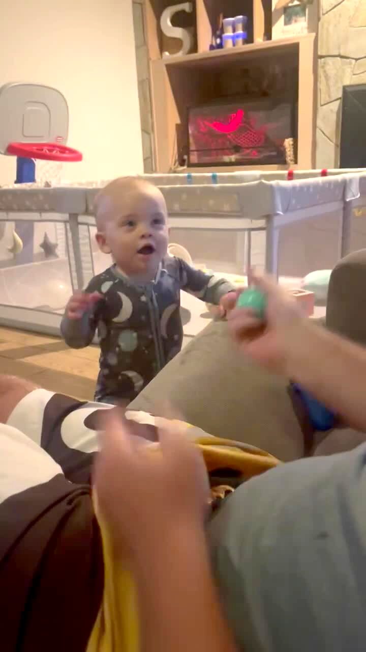 A man throws a ball in the air in front of his young son and quickly switches it into the other hand. When he opens his hand and the ball is not there, the boy is contused and shocked.