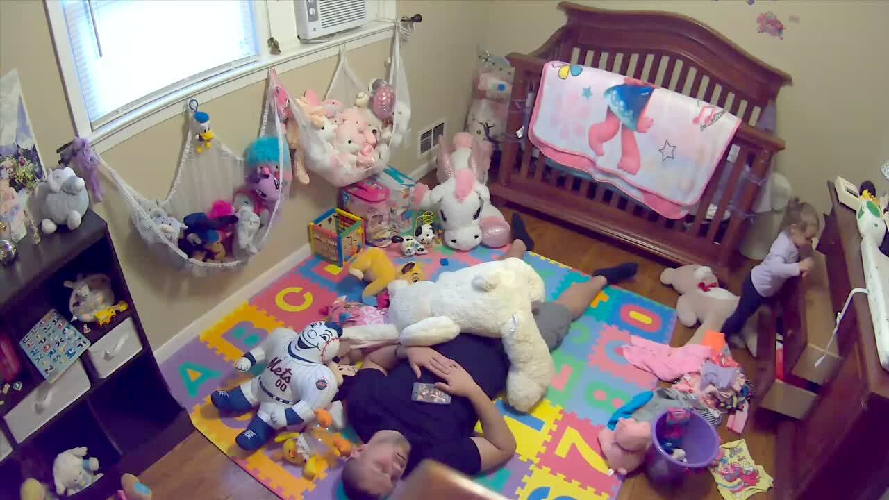 A man is fast asleep on a young boy's bed. The boy walks in and throws a toy at his back and hides. The man doesn’t respond to this, the tot boy comes out and starts to walk towards the man. The man throws a pillow directly in his face. They both laugh. Security footage.