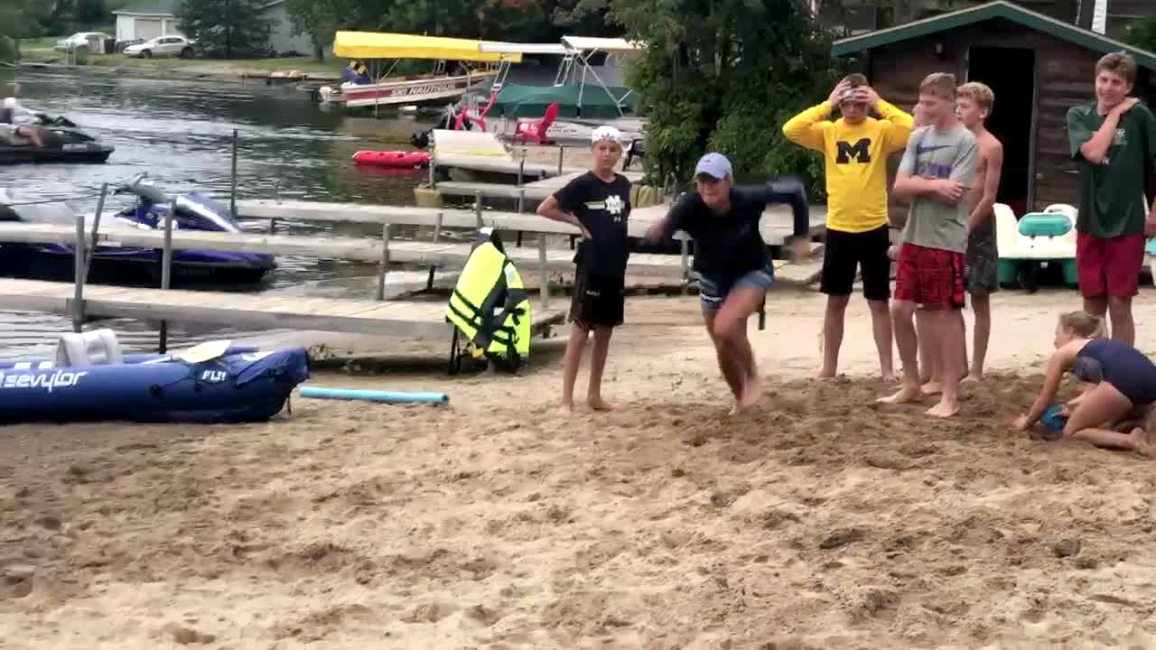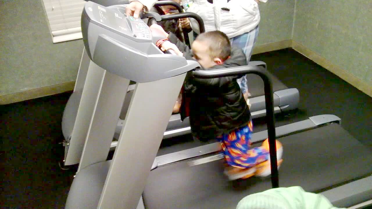 A young boy runs on a trampoline at home and struggles to keep up as it goes faster and faster. He loses his footing and falls.