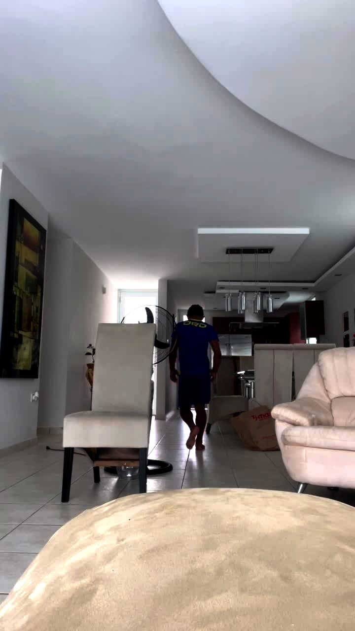 A woman in a living room runs and jumps over a toy bench and trips and falls and lands hard on the floor. Security footage.