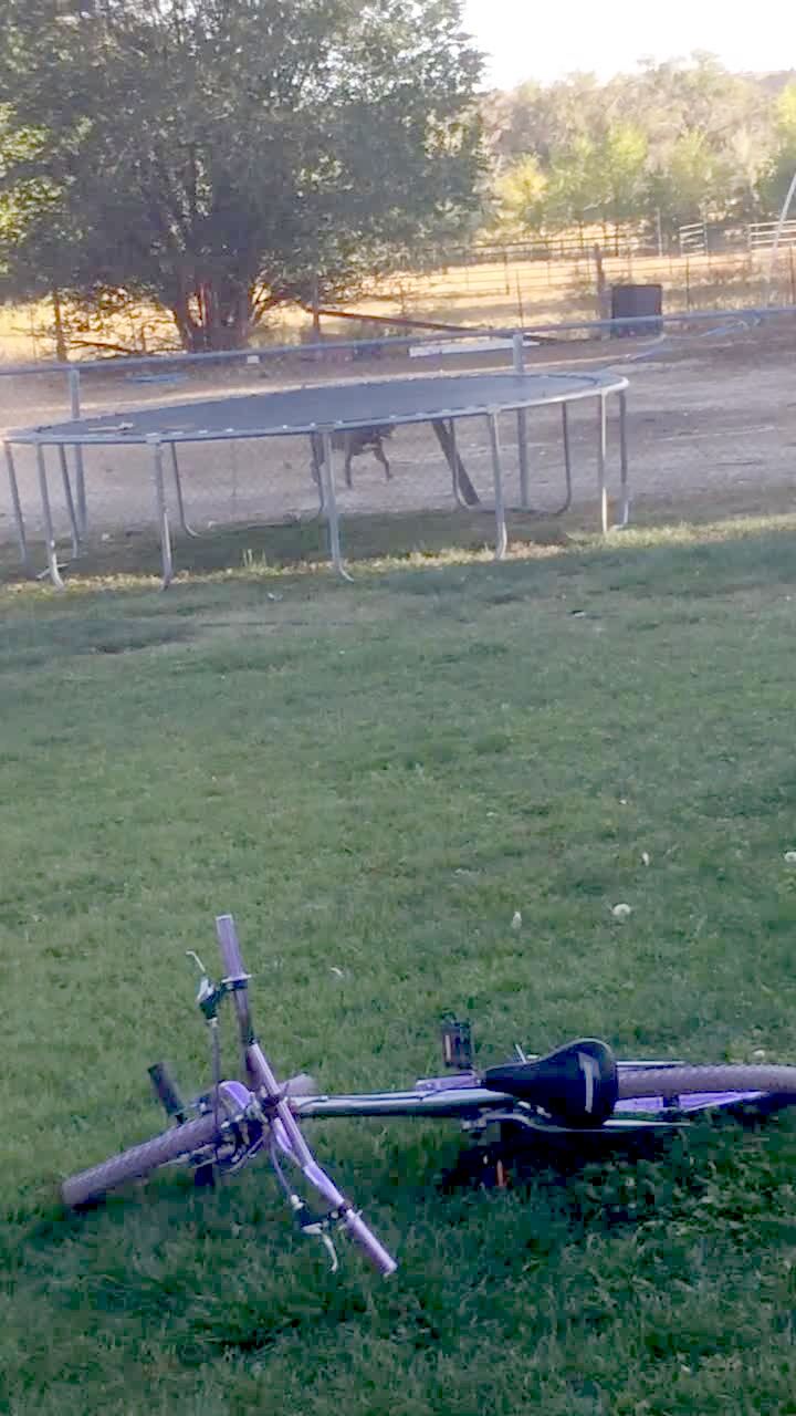 A dog runs in a yard and jumps on a trampoline and bounces and flips through the air and falls off the trampoline and lands on his back.