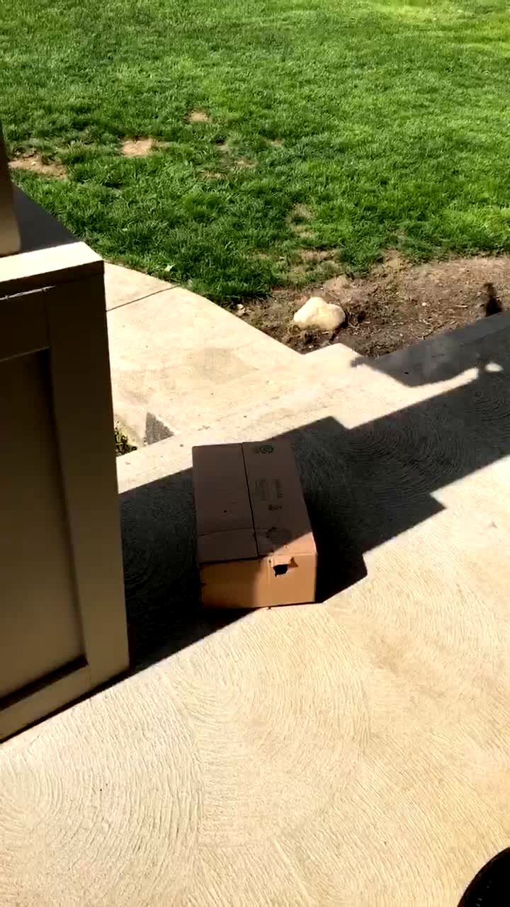 A dog attacks a package on a porch and carries it into the yard and tears the cardboard box apart.