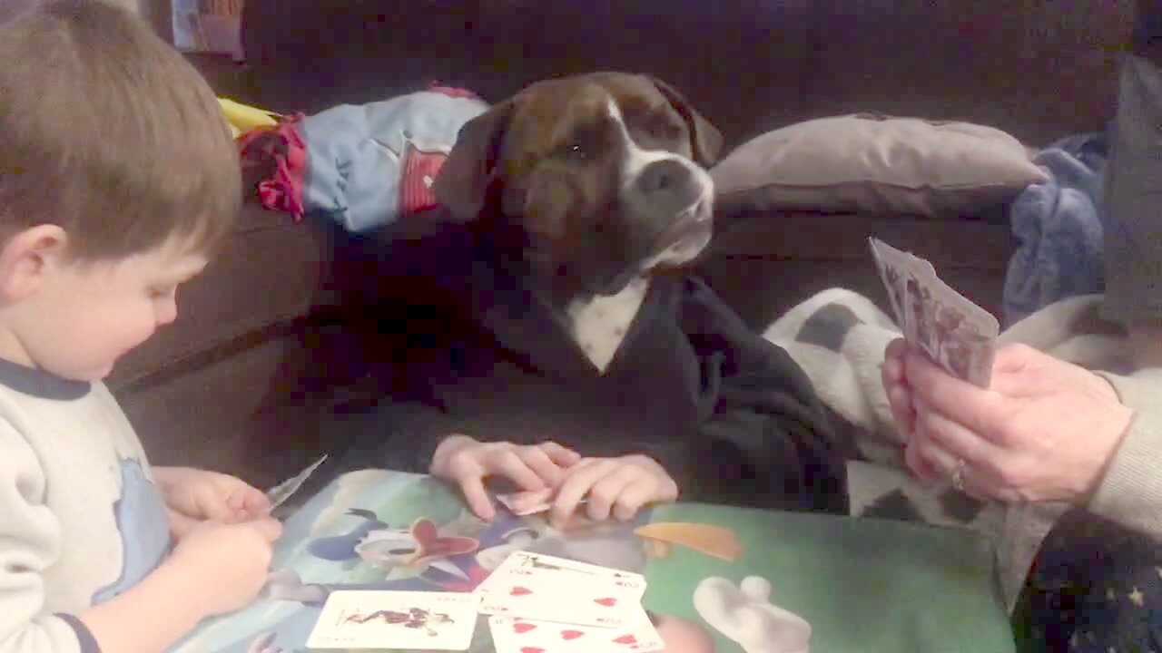 A Pitbull dog with human hands plays cards with a family in the living room.