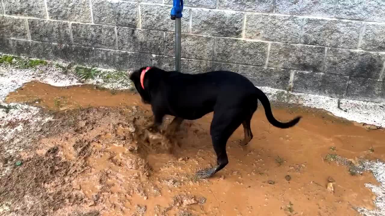 A black Labrador retriever dog digs in a puddle of mud in a yard, then he sticks his head in the mud and looks at the camera.