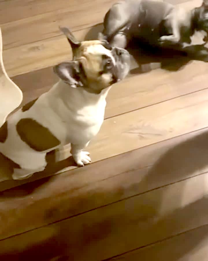 A woman says "bang" and one of her French Bulldog dogs rolls onto its back in the house, then pushes the other dog with its nose to roll over.