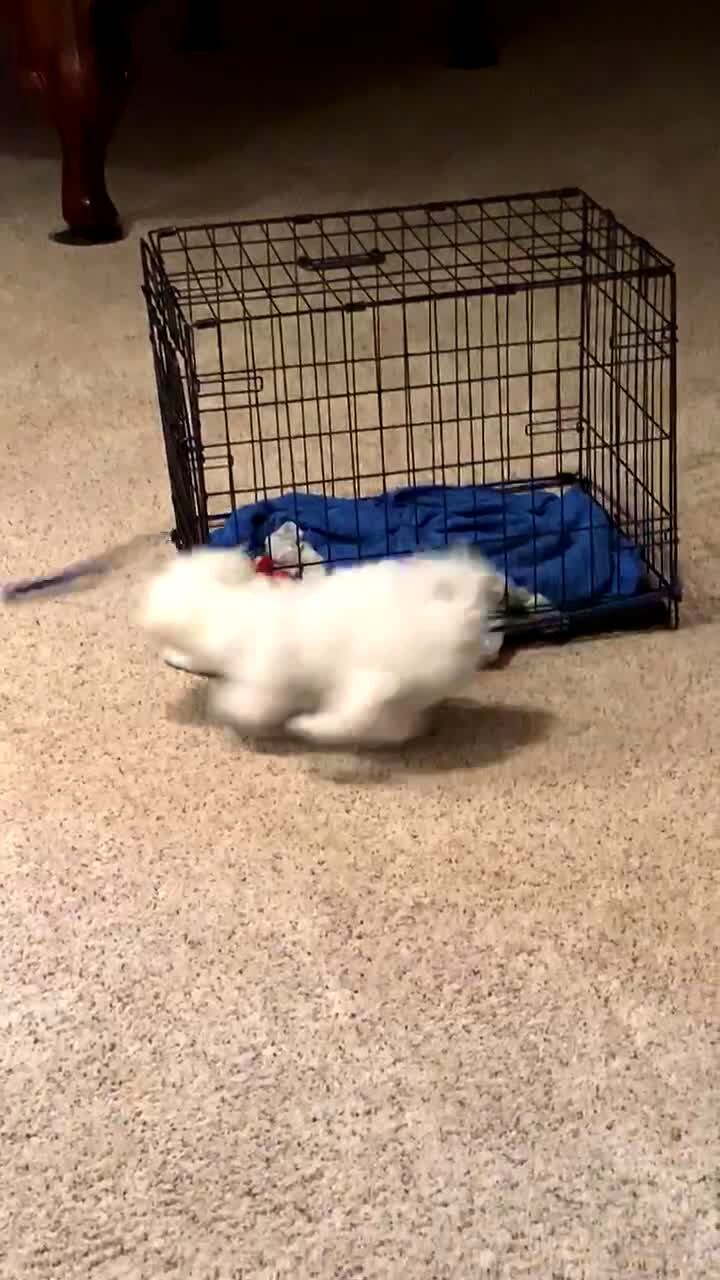 A puppy dog chases his leash while he runs in circles around a kennel crate in the living room.