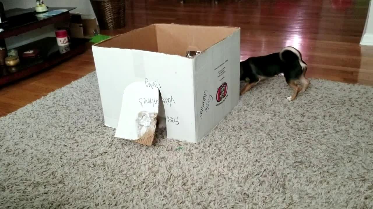 A dog barks at a cardboard box in the living room and then a cat jumps out of the box and attacks the dog and it runs away. The cat crawls back into the box through a hole to get away when the dog runs back. The cat jumps back out and does the same thing when the dog comes back.