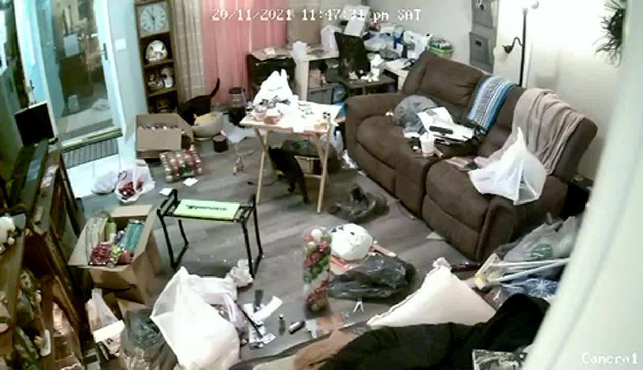 Two cats play fight in a living room. One cat does ninja like moves and a flip, trying to intimidate the other.