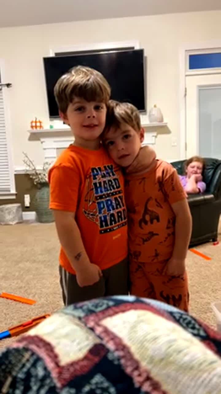 Two young boys are told that they will get to go to the zoo tomorrow while they stand in a living room. One boy pushes the other one down in excitement.