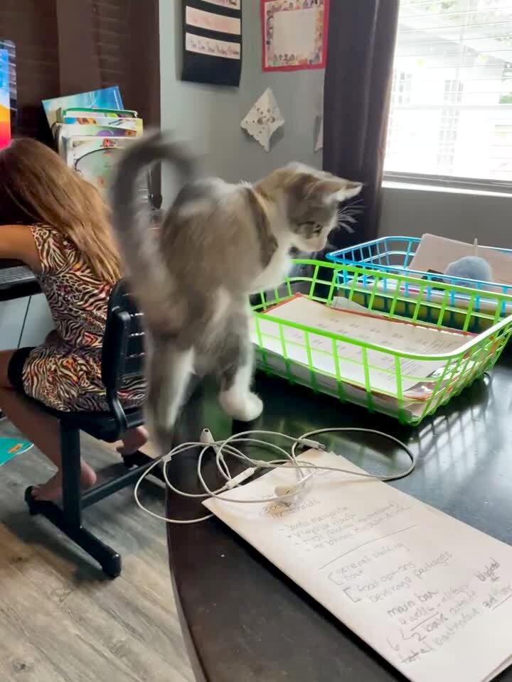 A kitten cat steps into a bin of papers and falls off of a table in the house.