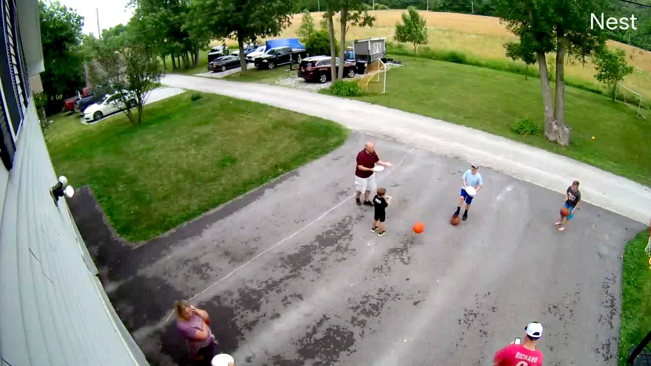 A young boy stands outside the open window and sprays a hose at a woman in her bedroom. His irate mother yells at him to stop.