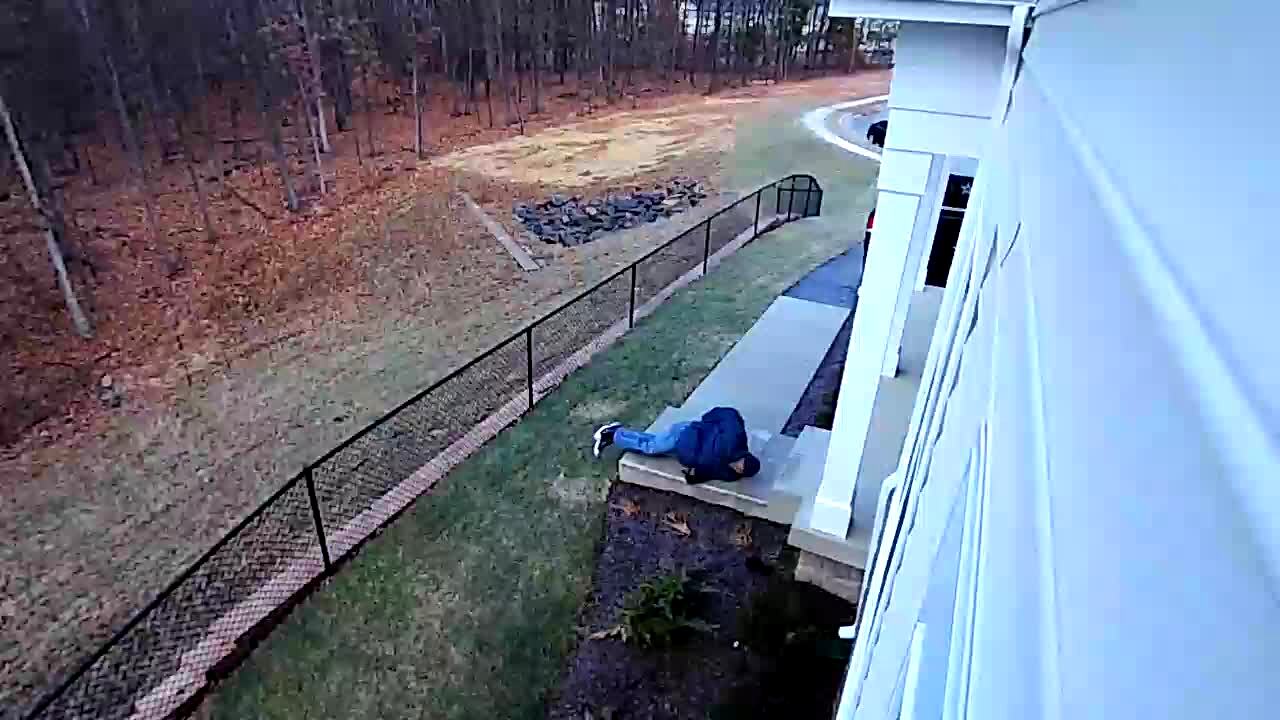 A man slips on ice when he walks on the patio steps of the house and falls on his back. Home security camera footage. No audio.